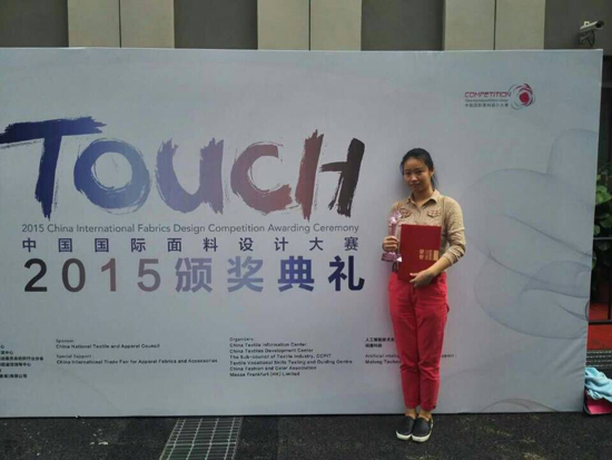 2012级染织11202班的段艺菲同学喜获2015中国国际面料创意大赛银奖。这也是我校第一次获得该项赛事银奖,此前我校仅获得该项赛事的创意奖。
