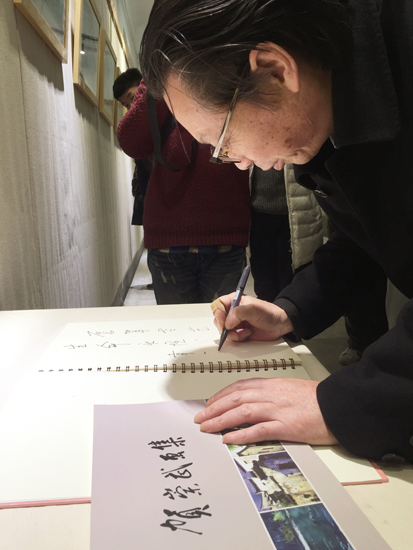画展伊始,韦校长和艺术学院领导就陪同贺崇武老先生一起欣赏画展,他们一边欣赏画一边谈论:“从纸张的选用谈到光线变化与做画时间的联系;从绘画作品的风俗人情谈到自然生态。”韦校长感慨万分,贺老从退休至今快20年了,但还是没有停下对艺术创作的脚步,这种追求艺术至上的精神值得我们大家学习和敬仰。这次能够在学校再次展出画作期间必定经历了许多艰辛,希望艺术学院的老师和同学们能够珍惜这来之不易的机会,与贺老多交流多沟通,把中国艺术的精髓发扬光大。韦校长参观完画展后,对画展给予了高度肯定,并为贺崇武画集题词。