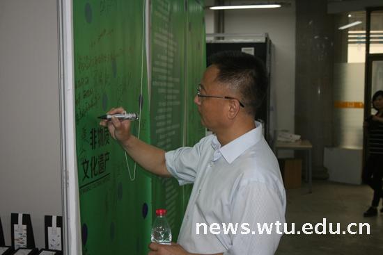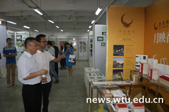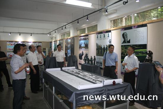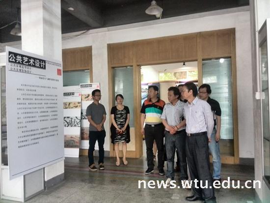 在公共艺术专业展厅,独居历史文化特色的壁画设计和3D效果实物得到了韦校长的认可。展出的18组作品中,80%的作品是依托学院与黄冈恒天集团的项目作品,这不仅充分体现了艺术学院产学结合的教学模式,也为学生的理论学习和实践动手能力提供了平台。韦校长表示,黄冈的历史文化和名人不少,通过这样的形式,不仅在专业上为学生提供了学习条件,更让学生在完成作品的同时学习了传统文化和历史,极大地丰富了学生的人文素养。这次的作品展能与学校纺织特色相结合;能与市场(企业)需求相结合;能与校园文化活动相结合。
