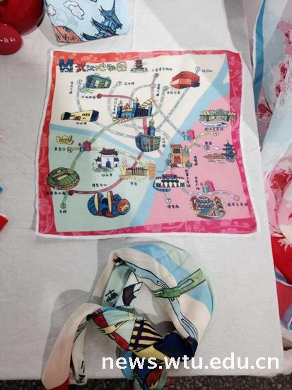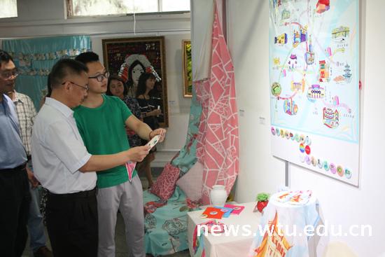 在工艺美术专业展厅,来自染织11101班张佳宁同学设计的Q版武汉市地铁效果图更是吸引了大家的眼球,他介绍说,作品设计的理念来自武汉已经完成和正在规划的地铁效果图,通过卡通的表现手法将武汉市地铁线附近的标志物画出来,印在手帕和方巾上,即可佩戴也可以为来武汉的旅游者提供旅游指南,所谓一举两得。罗校长非常喜欢小张同学的设计,他建议到,艺术学院可以将武汉市地铁效果图再加以完善,设计出样稿,后面在条件允许的情况下,可以将效果图印制在手帕上,等到九月份迎新的时候为纺大新生每人提供一条,既可以在军训中擦拭汗水,也可以为他们更快地了解武汉提供方便。同时罗校长提出,通过艺术学院学子们的作品,可以看出同学们能设计、能动手和能创意,并将创作的作品和制作作品保持一致;创作的作品与市场售出的商品在质量上保持一致,实在难能可贵。