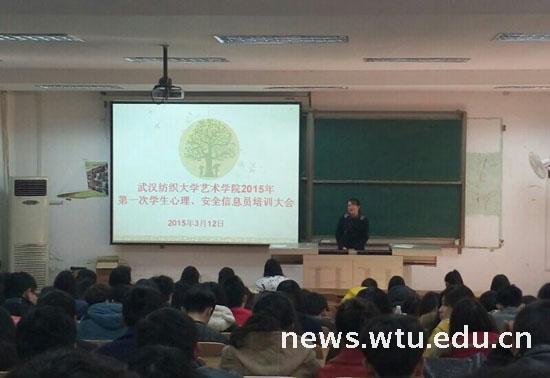 为了建立宿舍、班级、学院三级心理健康教育预警机制和快速反应系统,及时了解学生的思想和心理变化,排查心理、安全隐患,3月12日下午,艺术学院召开了2015年第一次学生心理、安全信息员培训大会。分党委副书记苗淑贤,各年级辅导员,各班班长、生活委员、心理委员和寝室长共200余人参加了培训大会。