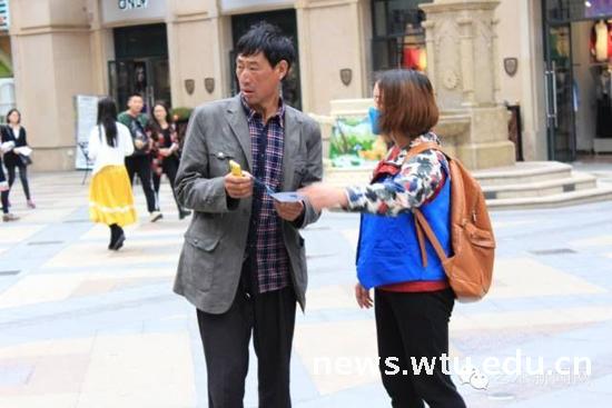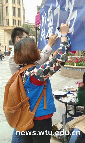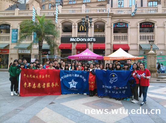 “你知道有这样一群孩子吗?他们拥有俊秀的脸庞,却充满迷茫与不解……”。下午2点蓝灯志愿团与武汉大学、华中科技大学、华中师范大学和中南民族大学的高校志愿者们在光谷广场联合举办了以“星星不说话”为主题关爱自闭症群体的宣传活动。来自各大高校的志愿者们在蒙蒙细雨中开始了宣传活动。蓝灯志愿者们在雨中向路人宣传有关自闭症的知识,并邀请他们在横幅上签名为自闭症群体献上一份祝福。活动中,志愿者们还利用喊口号——“以爱之名,与爱同行,关爱自闭症群体”,邀请人们欣赏自闭症儿童的画作。