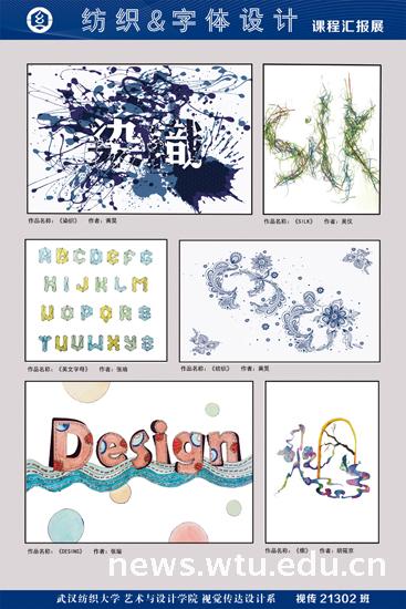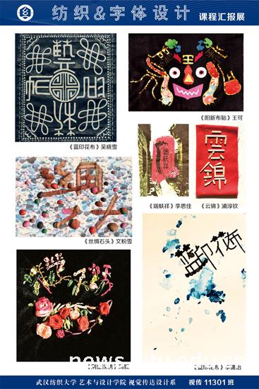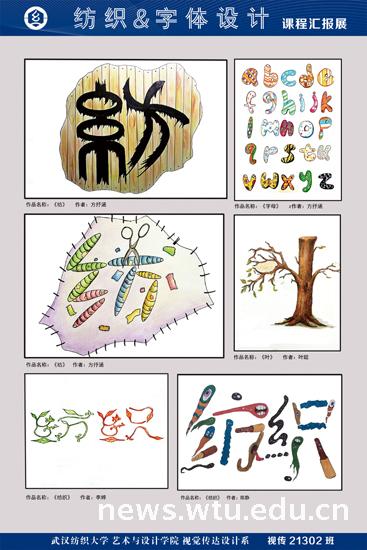 《字体设计》是视觉传达设计专业的基础课程,共36个课时。该课程开设以来,除了在设计教学过程中注意培养学生的专业理论知识和设计能力外,每年还会根据不同的设计“主题”来加强学生的研究方法与思维创新能力。视觉传达设计系主任曹刚介绍:“今年,该课程以‘纺织’为主题,在展览的作品中,既有平面字体设计也有利用纺织材料进行后期加工的设计作品,在艺术风格和艺术表现手法上呈现出不同材料‘亲密接触’的奇特效果和不同作品的艺术创新。”
