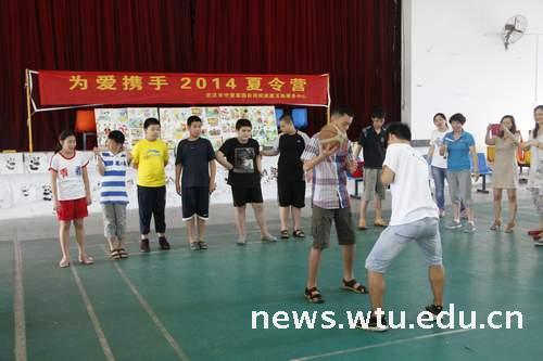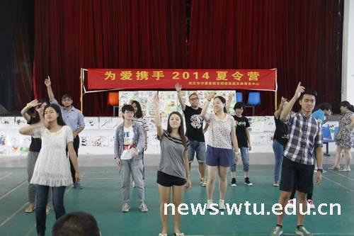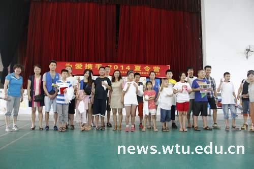 7月15日上午,蓝灯志愿团关爱自闭症儿童暑期夏令营活动闭营汇报演出在南湖校区大学生活动中心二楼隆重举行,武汉纺织大学蓝灯志愿团、武汉大学“点亮蓝灯”社会实践队,华中科技大学志愿者社会实践队、湖北美院国画系志愿者队、五名来自巴西、土耳其、印尼、马来西亚、印度的外国志愿者、武汉市自闭症亲友会、20多名自闭症儿童及其家长,共计200多人参加了汇报演出。