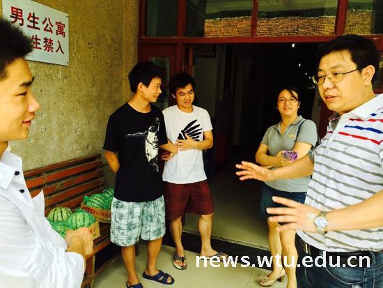 随后,学院领导来到学生宿舍,看望暑期留校考研及实习的学生。考研学生张靖宇说,暑期留校对于武汉高校的学子们来说的确是个不小的挑战,但是任何事情的成功都必定会有汗水的付出,所以这都是值得的。学院领导及辅导员多次关心我们的学习生活,为我们解决后顾之忧,让我们能安心学习。胡中原书记表示,同学们要注意劳逸结合,注重学习方法,提高复习效率,在外实习工作的同学要注意安全及防暑降温。