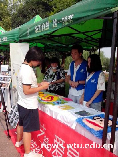 这13名武汉籍的新生是在学院的新生QQ群中认识了蓝灯志愿团,并得知这次志愿者活动的消息,便主动要求参加这次活动。早晨10点,他们相约在解放公园见面,可是由于彼此不认识,花了半个小时的时间才全部找到,他们还来不及寒暄,便开始了活动,和自闭症儿童一起制作了印有自闭症儿童画作的T恤、环保宣传袋、编织坐垫等生活用品。下午2点,他们在江滩公园开始了义卖活动,宣传自闭症知识,吸引了不少市民前来观看,且纷纷慷慨解囊,资助自闭症儿童的成长。活动现场,艺术学院新生辅导员孙老师第一次见到了自己的学生,激动不已,并和新生们拍下了大学生活里的第一张合影。
