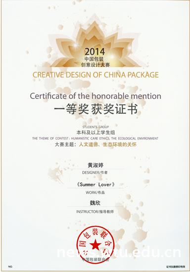 最终,我校艺术学院教师曹刚、薛燕妮、杨薏老师的作品分别获专业组一等奖1项、二等奖4项和三等奖2项。而来自艺术学院2011级视传专业的黄淑婷、刘娟等五名同学则获得了2014中国包装创意设计大奖赛学生组一等奖3项、另有20名学生分获学生组二等奖5项、三等奖8项、优秀及入围奖10项的优异成绩。同时,魏欣老师获得优秀指导教师奖,我校获得组织优秀奖。