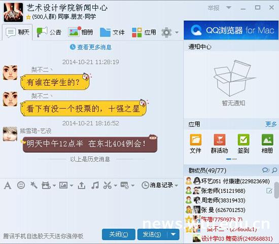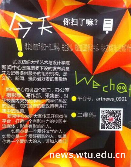 为确保微信平台良好运行,学院专门成立微信运行工作小组,实行小组责任制,明确到人,确保信息发送及时、准确。作为大学生喜闻乐见的新媒体传播方式,“艺术学院新闻网”将以及时有效地编发时政要闻、社会热点、学院时讯和校园文化活动为重点,宣传报道学院学子身边的优秀典型及事迹,鼓励广大学生珍惜时光、勤奋学习,使他们真正关心“中国梦、纺大梦”,使每名学生都能成为学院的“信息员”,传递正能量。