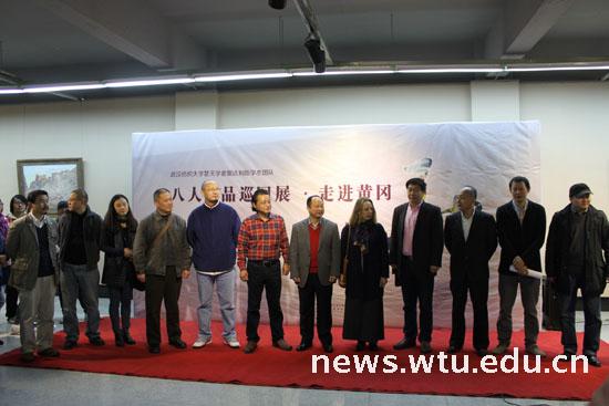 11月13日,院长欧阳巨波、书记胡中原携_娜达莉亚学术团队前往黄冈师范学院参加八人作品巡回展开展典礼,受到了黄冈师范学院党委副书记、纪委书记李金奇,美术学院院长李国庆一行的热情接待。