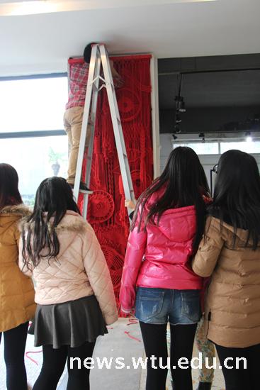 染织专业学生首次尝试大型的室内手工装饰,既检验了平时上课教学时的效果,同时又增强了同学们的动手能力和创作技巧,为今后完成毕业设计打下了基础。”现场参加组装的一名同学说,“编制这个作品不仅可以锻炼自己的设计能力还可以锻炼动手能力,同时看到自己设计创作的作品能挂艺术展厅感到无比自豪和骄傲。”