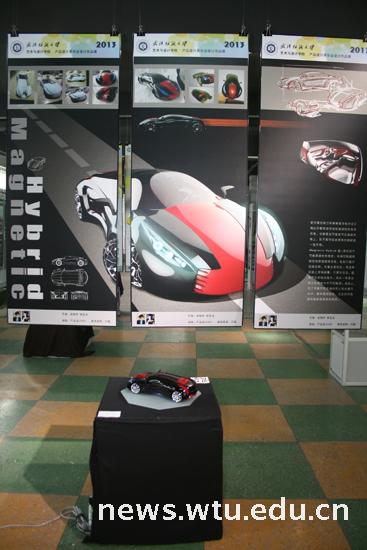 本次展览以校园文化延伸产品、科学玩具产品、交通工具及家电产品为主要创作对象,试图探讨技术与艺术、科学与审美的多种融合方式。李鹿、李泽秀同学的茶具系列设计采用能展现我校特色的符号作为造型语言,通过实际动手制作出精美的茶具用品。战伽恺同学的新能源概念汽车设计采用鲤鱼跃龙门的仿生形态,试图阐释未来汽车从传统的汽油动气向新能源的跨越。