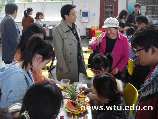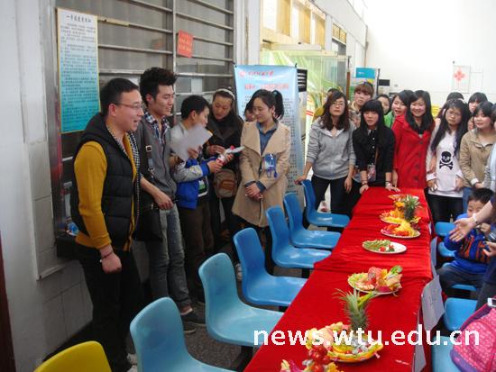 当天下午3点,活动在南湖校区学生食堂拉开帷幕。本次比赛共有14个以班级为代表参赛,每组6人。各参赛同学积极开动脑筋,不断创新,在比赛过程中互相帮助,有的切水果,有的摆造型,经过一轮紧张的制作,苹果、香蕉、草莓、橘子、黄瓜等各式水果、蔬菜,在同学们精细的刀工下,被改造成片、丁、丝、块等各种形状,拼放成各种图案,作品色彩艳丽,奇思妙想,精美绝伦。有的作品命名为“花开妇贵”,祈福母亲身体健康;有的作品命名为“同舟共济”,寓意纺大学子与母校同进步、共发展。作品充分展示了参赛学生的创新能力、动手能力以及感恩母亲、感恩母校的真挚感情。