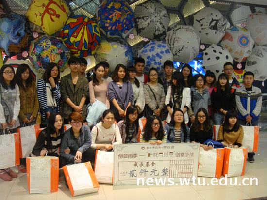在今年尝试的校企合作模式,学生将自己的创意通过手绘、手工编织等形式在雨伞上进行创作,作品通过新世界企业平台进行为期10天的展示,接受完全市场化得评选。最终,艺术学院视传11001班的姜昙同学凭借9600余票成功获得新世界百货2000元成长基金。