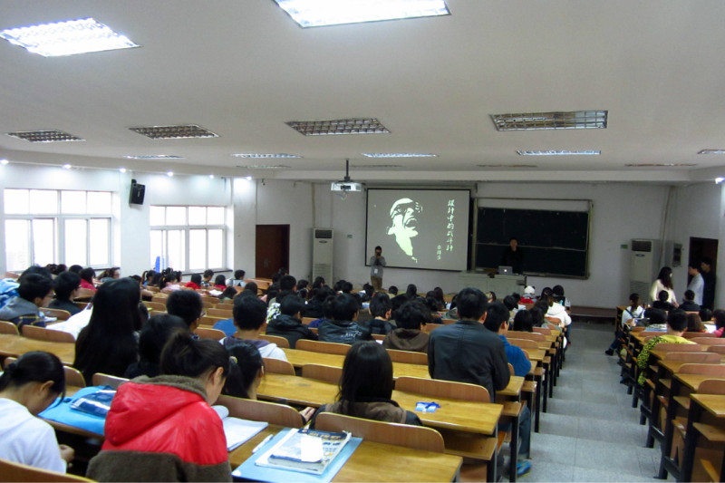 张泽宙以案例讲解和亲身体验为同学们介绍了他的创作立场和观点,并深刻分析了艺术专业学生的就业前景及大家关注的待遇条件问题,同时就如何利用课余时间学好专业知识,提高自己的设计能力,如何设计出一幅带“火药味”的海报跟大家作了分享和交流。他说,设计无处不在,希望同学们能够努力学习好专业知识和技能,打牢基础,服务社会。