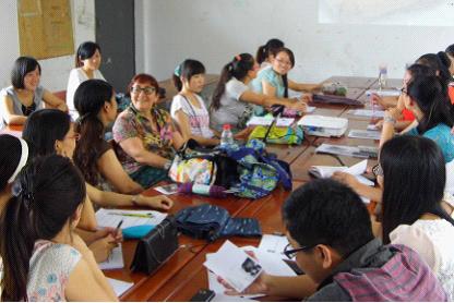 同学们正在老师一起创作艺术作品