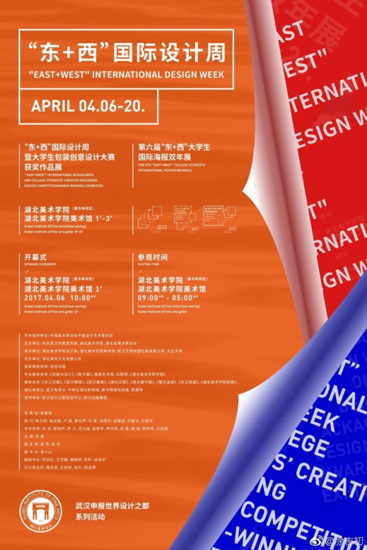 据悉,本次展览包括第六届“东+西”大学生国际海报双年展获奖作品展、2017“东+西”设计大师海报邀请展、“东+西”国际设计周暨包装创意设计大赛获奖作品展,在湖北美术学院昙华林校区开展,展览持续至2017年4月20日。