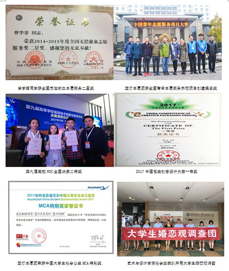 坚持“实践育人”,培养学生成为传统文化的传承人和发扬者;坚持脚踏实地,培养学生成为“德艺双馨”的艺术人才。学院现有蓝灯志愿团、平面设计师协会、ISE创新创业工作室等平台,通过鼓励学生参与创新创业、挑战杯和各类专业竞赛,参与社会实践,参加公益活动,做青年志愿者;参加校院文体活动,得到锻炼。获得湖北省“挑战杯”课外科技竞赛三等奖三项;第三届湖北青年志愿公益项目大赛暨湖北青年公益创业专项赛优秀奖,武汉市家公益大赛最具创意奖;全国纺织类高校大学生创新创业大赛三等奖;暑期社会实践项目,“90后”女大学生婚恋观调查获校级重点立项,被评为省级优秀团队,项目发表EI国际会议论文1篇;第六届啦啦操大赛并获二等奖,“我看党的十八大以来新变化”配乐朗诵比赛二等奖,第三届太极拳比赛三等奖,第七届大学生心理剧大赛三等奖。