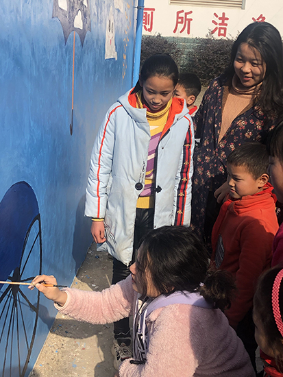 活动期间,刘凡教授和她的学生团队们与王要小学的留守儿童们进行了互动,随后为他们校园里空白墙面绘制了内容丰富,色彩鲜艳的文化墙。刘老师在指导学生绘制文化墙的过程中,边和孩子们讲故事,边分享了文化墙上的内容。她感慨万分,这是学院第二次来到王要小学,每一次来都有很深的感触,这些留守儿童们虽然生活学习的环境十分单一,但是他们对颜色的敏锐和艺术的理解却是丰富多彩。遗憾的是,王要小学的条件毕竟有限,这也是她为什么会定期来这里开展艺术活动的原因。