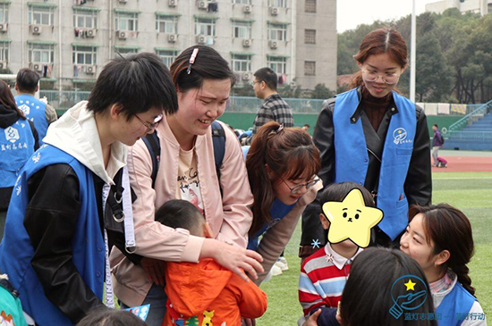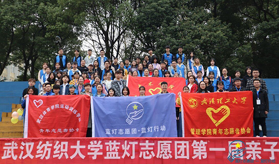 3月17日, 武汉纺织大学蓝灯志愿团“迎军运 爱星星”亲子运动会在南校区足球场隆重举行,在武汉体育学院、武汉理工大学等高校与蓝灯志愿团共百余名大学生志愿者的组织与带领下,与42名自闭症儿童以其家长共同完成运动会的十二个游戏项目。