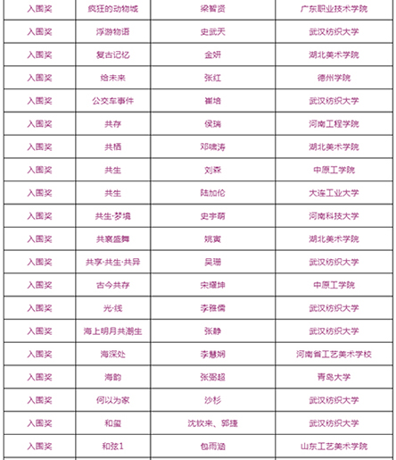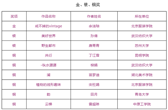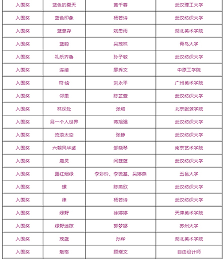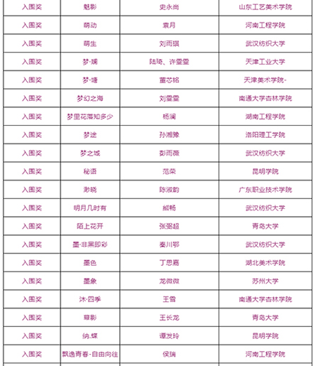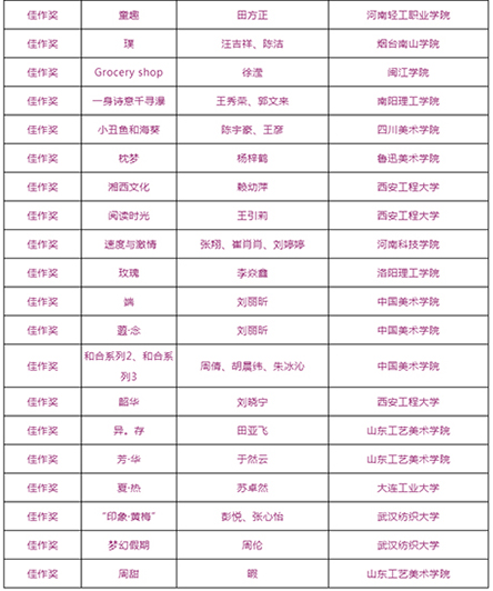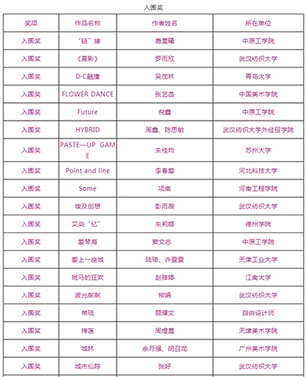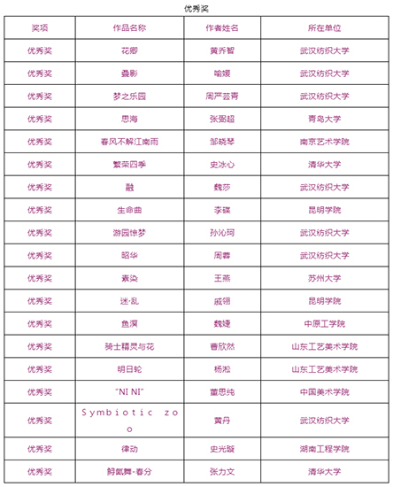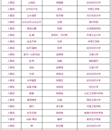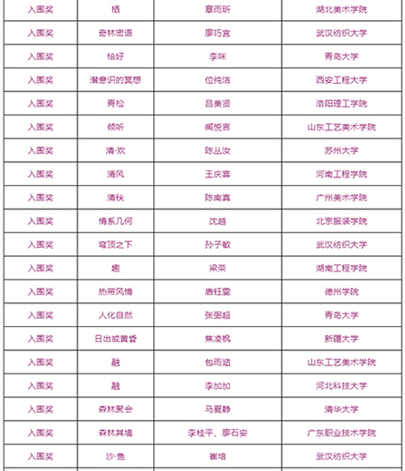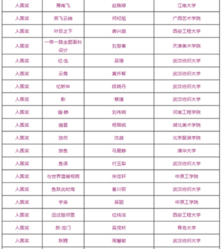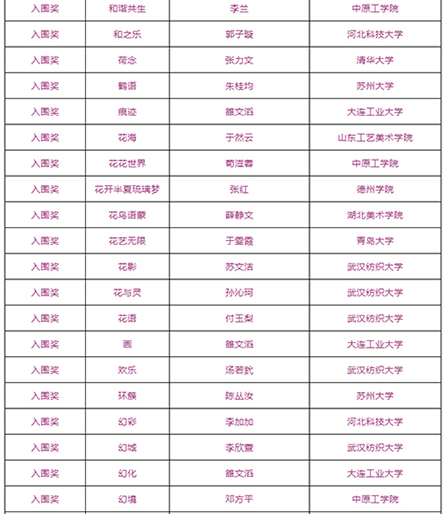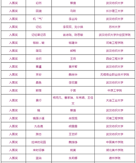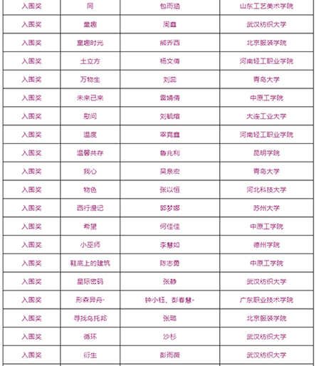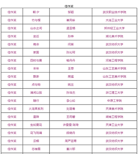 由武汉纺织大学及山东工艺美术学院、烟台市福山区人民政府、烟台明远家用纺织品有限公司、山东省省委民营企业高质量发展烟台服务二队共同承办的国际性赛事——“明远杯·国际家居纺织品创意设计大赛”大赛阶段圆满结束,下一步大赛即将进入“工作坊”阶段,现将大赛阶段的获奖名单公布如下: