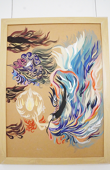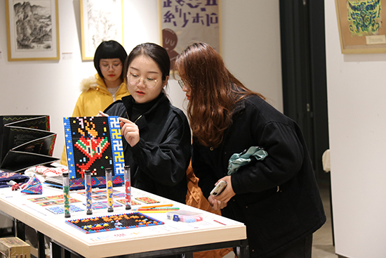 在展览中胡蝶与张国荣同学的书籍作品《贝锦卡》颇受欢迎。“贝锦卡”在土家语中意为土生土长的土家人,这本书以土家族的非物质文化遗产西兰卡普(土家织锦)作为主题,提取了土家织锦中的纹样,对这些纹样进行改造与重塑,大量运用在书籍内页与封面封底等设计中。这本书的故事是改编自土家族传说“西兰姑娘”,内涵丰富,意蕴深远。用现代趣味性乐高的形式表现民族非物质文化遗产,各美其美,美美与共。让当代年轻人能够了解、喜爱、弘扬中华博大精深、源远流长的传统文化。沈钦来同学的作品《孕育》,结合中国书法及水墨画的韵味,“孕”和“育”中的共同笔触,其走向形似孕妇的侧轮廓,借枯木意象笔划,表现一种文化的不朽精神,以此作品来表达中国传统文化进行传承的别样形式,现代文明多由优秀的传统文化孕育而来。