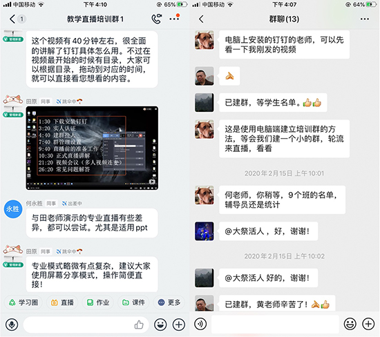 结合各个教师所处的环境以及网络设备制定了《不同条件下的授课方案建议》并分批建群,给各个教师进行了系统化的培训。特别是在“钉钉”直播平台上为老师详细的讲解了如何操作,例如如何下载安装钉钉、实人认证、建群拉人、群管理设置、直播前的准备工作(上传课件PPT、布置作业) 、正式直播讲解、视频会议等等一系列培训和问题答疑。