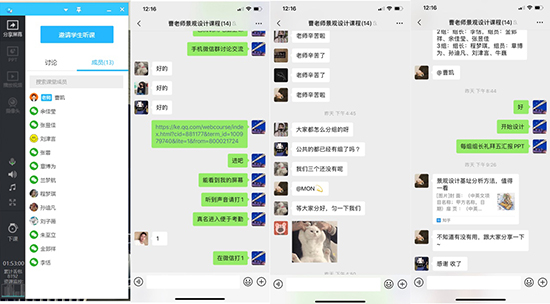 教师熟练的运用 “雨课堂”“超星平台”“钉钉”“微信平台”“腾讯课堂”等教学软件。老师对学生们首先进行了考勤,以确保每位学生都在线上,然后通过课件PPT进行了生动的讲解。待直播课程结束后,学生们又通过微信群进行了有序的分组,老师也在线上布置了小组作业。