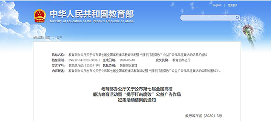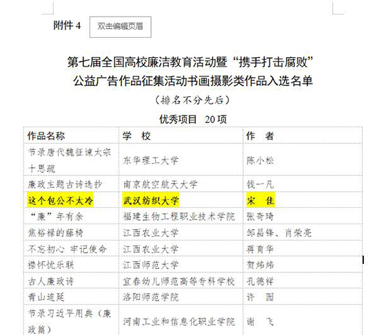 日前,由教育部思想政治工作司主办的第七届全国高校廉洁教育活动暨“携手打击腐败”公益广告作品征集活动评选结果揭晓。我校共推选出11件优秀作品报送,最终色情直播平台