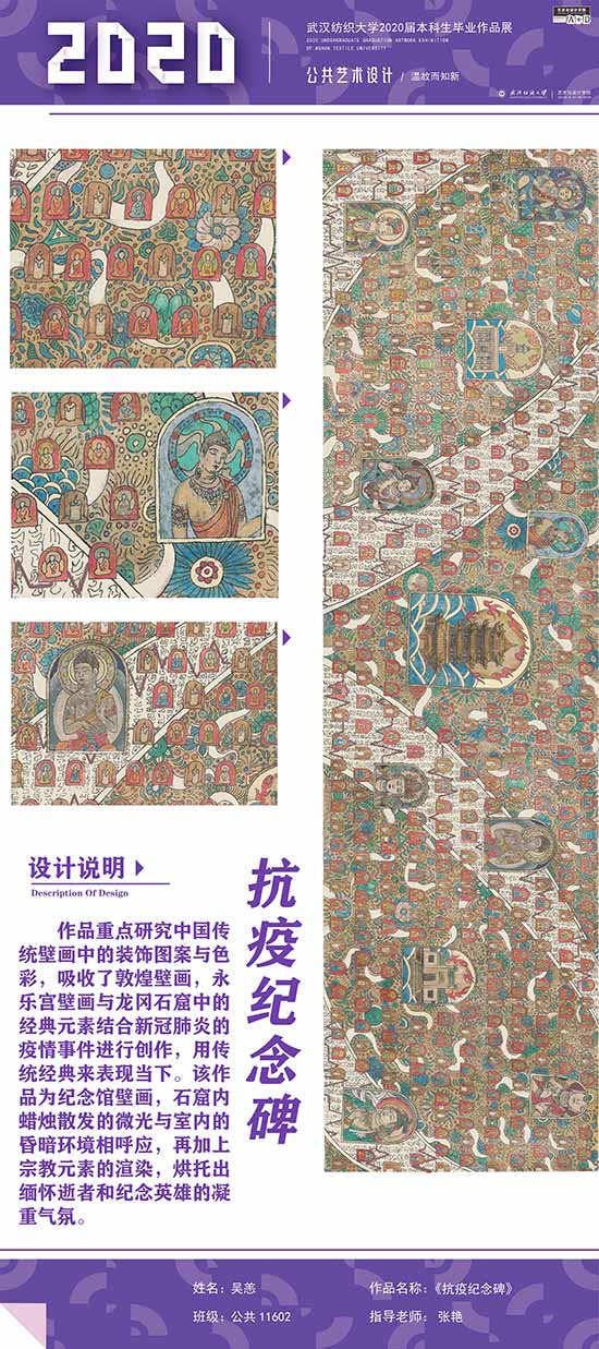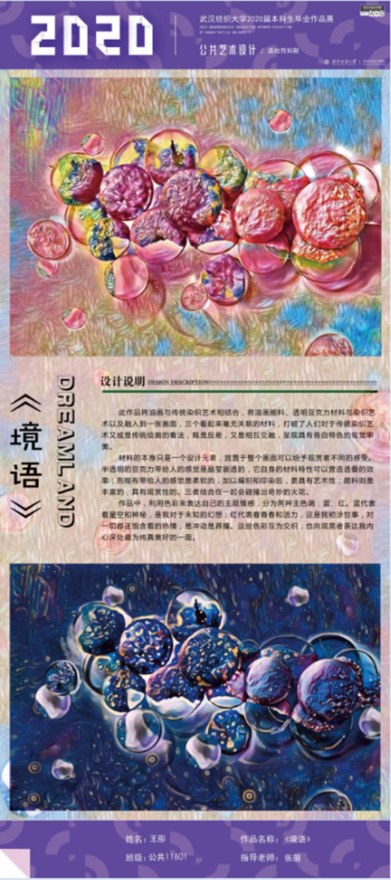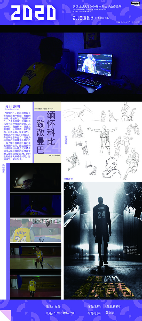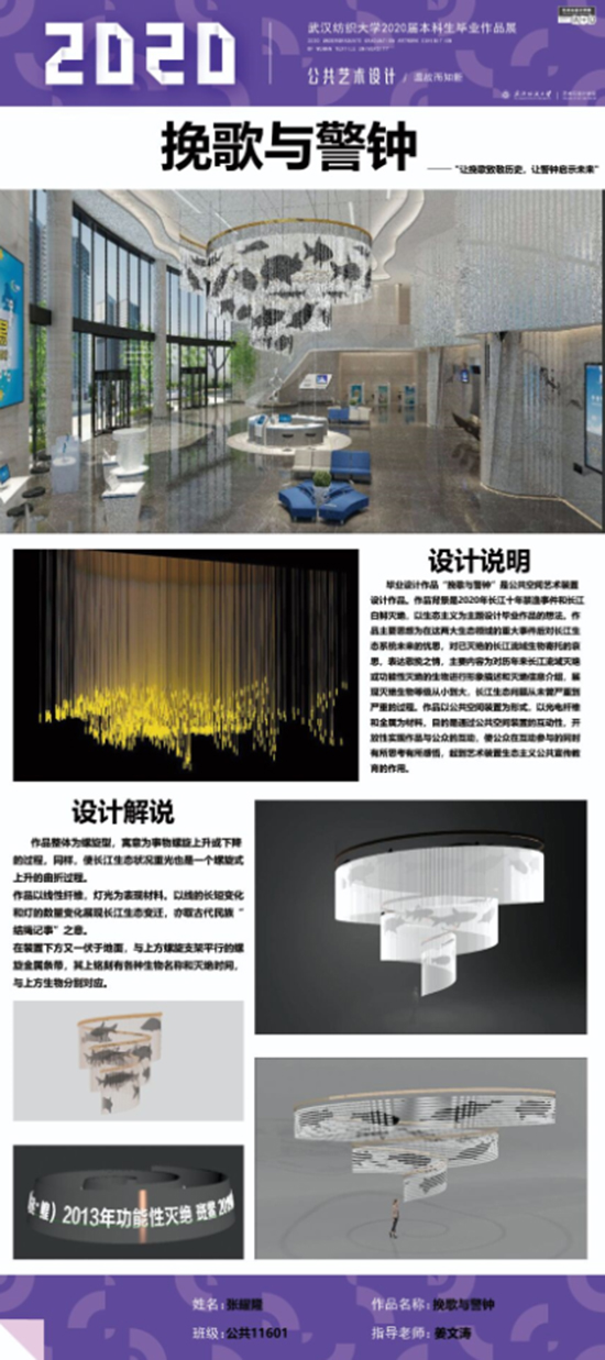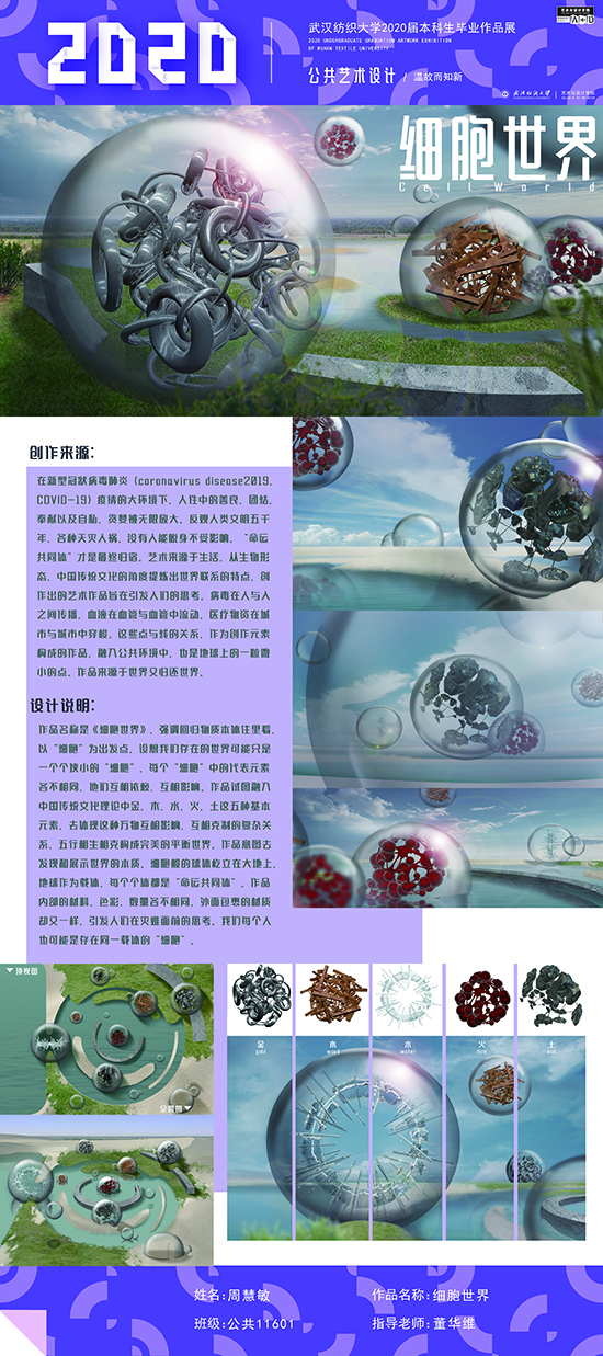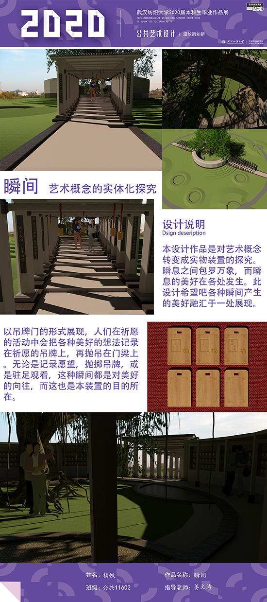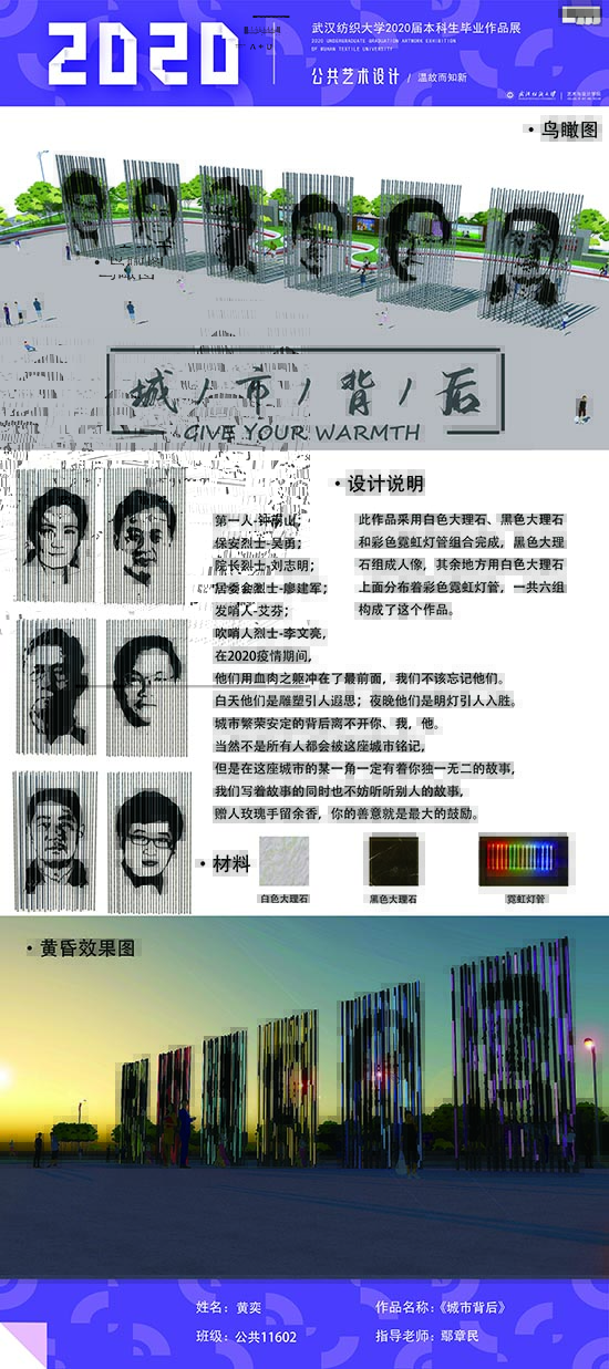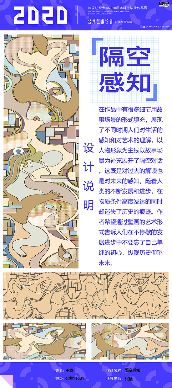 艺术改变了生活,让我们从新的视角去感受人生、体验社会、寻找生命的精彩。2020届公共艺术11601班同学们的毕业设计作品,围绕着同一个主题—温故而知新,在这些作品里能够看到每一位同学对世界、对自我的不同认知和思考,在不同的艺术形式中,我们感受到了无限的活力和想象力,并被作品丰富的创造力深深触动。毕业设计作品凝聚了同学们四年的心血,体现了我们对公共艺术的认知与创新。由于疫情原因,2020届是一群特殊的毕业生,伴随在学习和创作过程中的艰辛和迷茫都是值得珍惜的经历,所有的付出都有目共睹,这一切都将是青春最珍贵的记忆。