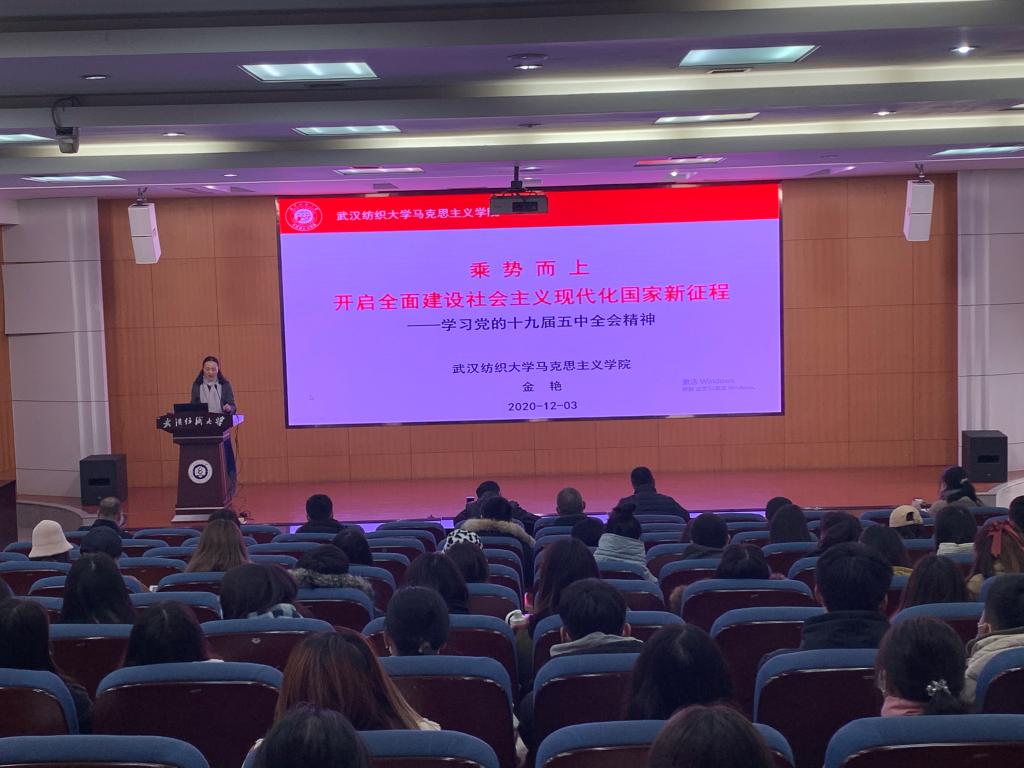会上,马克思主义学院院长金艳教授作了题为《乘势而上——开启全面建设社会主义现代化国家新征程》的宣讲报告。金艳以党的十九届五中全会概况为开篇,用“两个大局”和“两个判断”分析国内外形势,梳理两条逻辑主线——“三高”和“三新”。实现“十四五”规划和2035远景目标,必须坚持党的全面领导,充分调动一切积极因素,广泛团结一切可以团结的力量,形成推动发展的强大合力。要加强党中央集中统一领导,推进社会主义政治建设,健全规划制定和落实机制。要保持香港、澳门长期繁荣稳定,推进两岸关系和平发展和祖国统一。要高举和平、发展、合作、共赢旗帜,积极营造良好外部环境,推动构建新型国际关系和人类命运共同体。