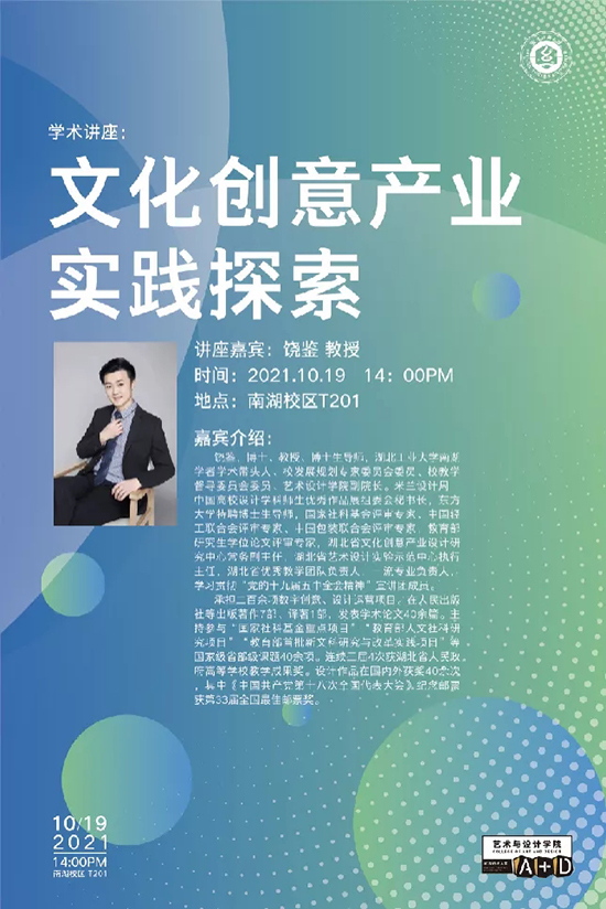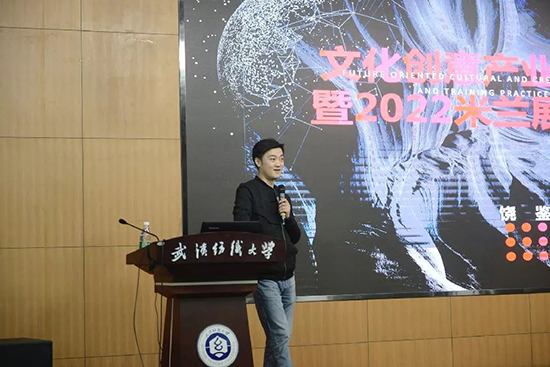 首先由来自湖北工业大学艺术设计学院副院长、米兰设计周—中国高校设计学科师生优秀作品展组委会秘书长饶鉴教授,带给大家一场“文化创意产业实践探索”的专题讲座,他结合自己多年的设计教育经历以及设计实践探索,通过展示与介绍大量的案例和设计作品,从人工智能艺术、传统工艺复兴、创新用户思维、青年建工立业四个方面为主题,就“未来以来”的大环境发展前景作出了深入阐述。他生动的讲述了人工智能如何与艺术设计创作相结合,形象的讲述了“百工百匠”如何进行传统工艺复兴,从“市场难、产品难、渠道难、联动难”四个方面,深入剖析传统工艺的市场现状,他指出“要用新媒体、新金融、新平台来打造新时代手艺人IP,复兴民艺,传播中式美学生活方式,让中国民艺文化走向世界。”饶鉴教授的此次分享,启发了同学们对未来发展环境中设计的思考,使同学们受益颇深。