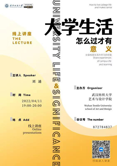 4月11日晚7点,产品设计118001班的班长刘通同学与学院其他同学分享了自己大学生活的体会。他主要从六个方面来谈了自己的感触:
