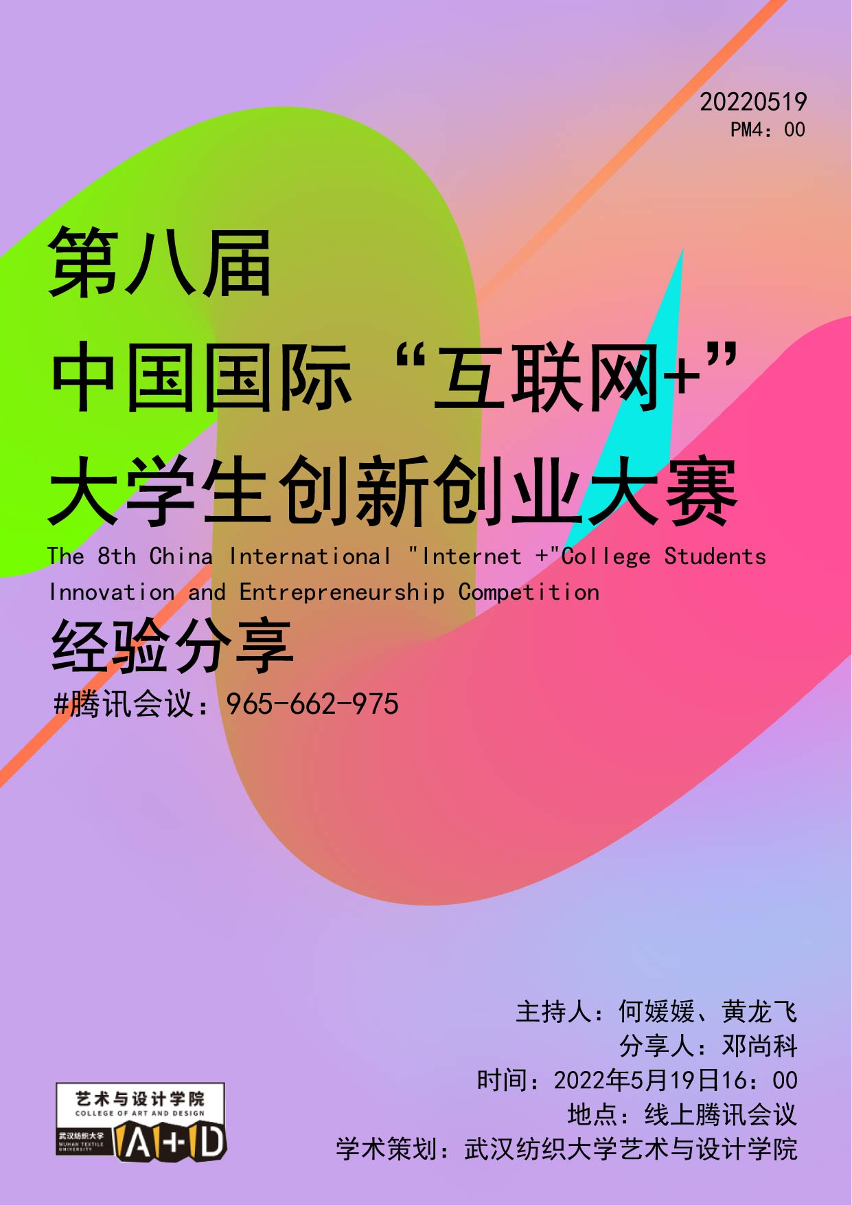20级研究生邓尚科。通过线上的方式,邓尚科同学从赛事介绍、如何参赛、项目挖掘等各方面分享了自己的经验和感悟。视觉传达系主任黄龙飞,教师何媛媛以及各年级学生八十余人参与了本次分享活动。