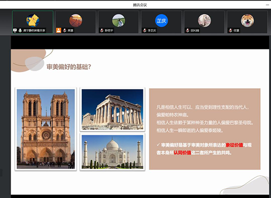 陆老师在论坛讲授过程中,还组织了学生讨论环节。例如龚宁静同学就“审美偏好”这一概念结合“文化差异性”分享了他的看法,认为审美偏好是基于审美对象所表达的象征价值与观者本身所认同价值这两者之间产生的共鸣;高慧同学就“审美观照”和“审美经验”特点谈到了日常生活的审美泛化现象以及思考。