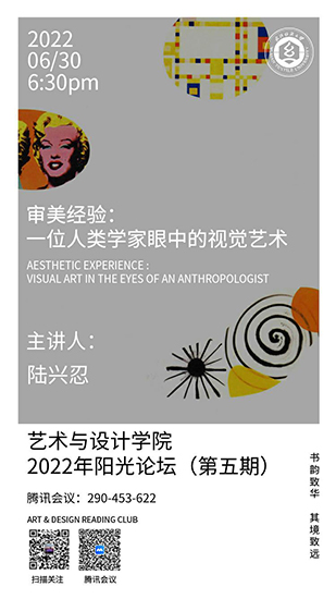 本期阳光论坛艺术学院教授陆兴忍老师对雅克·马凯先生所著《审美经验:一位人类学家眼中的视觉艺术》进行主讲分享,首先谈到选取该书目缘由:一方面是基于作者从一个人类学家的视角,运用日常生活的审美经验,采用田野笔记的方式记录了他直觉体验的“自下而上”、“经验优先”的研究方法,正好跟前两次阅读会上沃尔夫林的《艺术风格学:美术史的基本概念》与叶朗的《美学原理》这两本书形成一个参照与补充,有益于同学们学习和掌握不同的艺术研究方法。另一方面,全书贯穿了人类整体的、文化地域性的、个体独创性的三层分析方法,这种基于观察,但不停留于一般观察的跨学科的研究方法也是值得学人学习的。