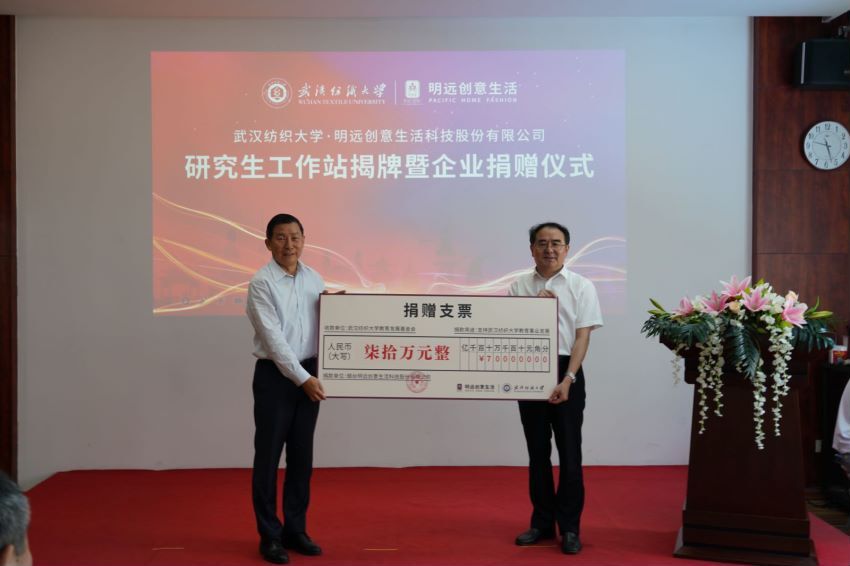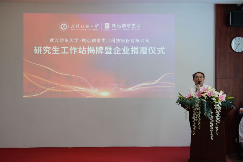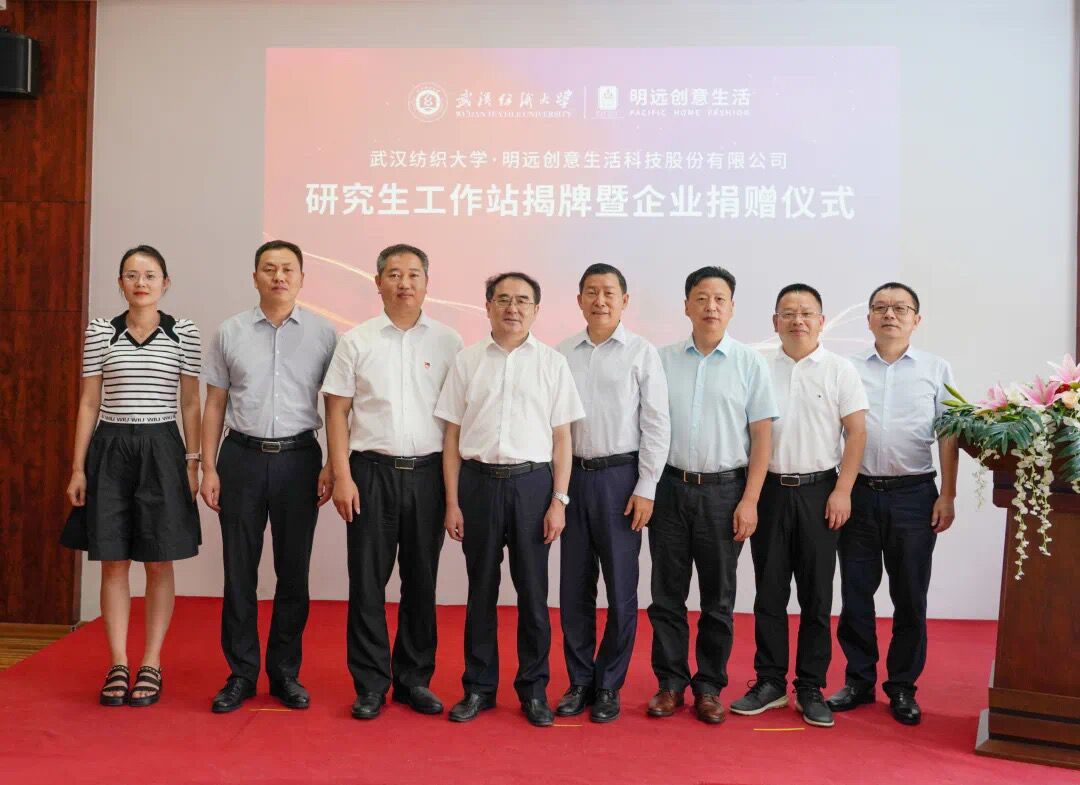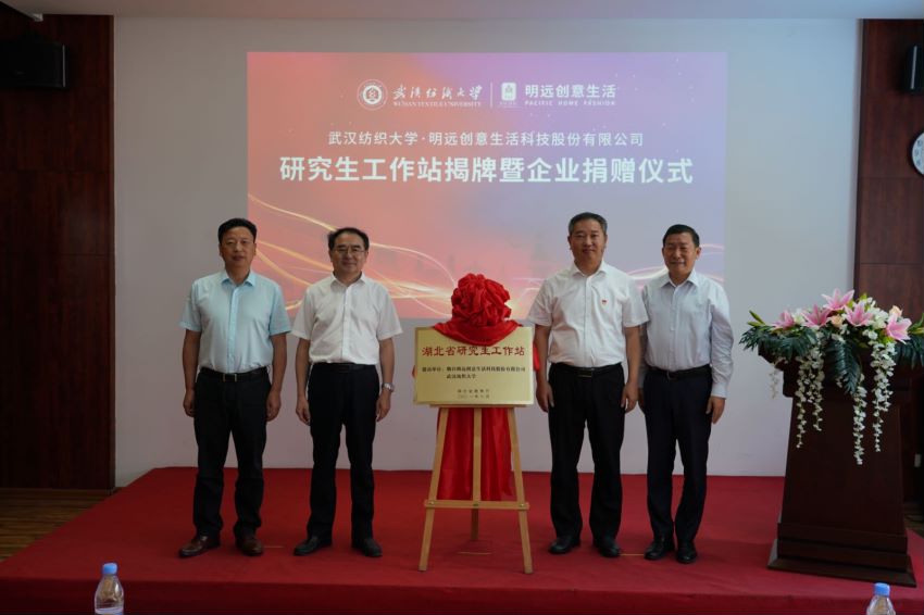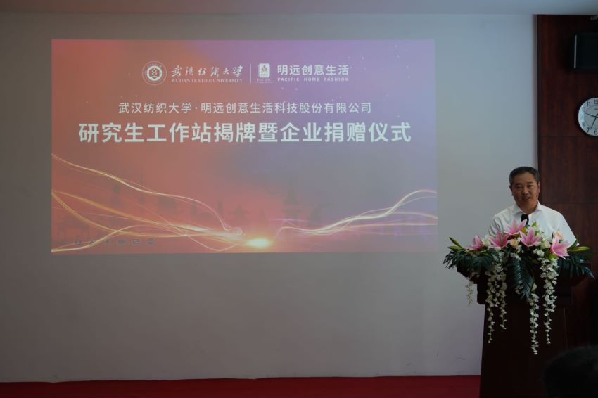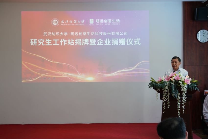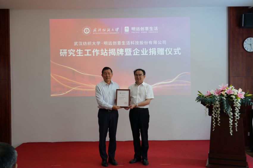 随后,双方代表报告“武汉纺织大学-烟台明远创意生活科技股份公司研究生工作站”前期的筹备情况及下一步发展规划和实施方案,接着校党委常委、纪委书记程碧海为研究生工作站揭牌,校党委书记田辉玉接受校友陈义忠董事长的捐赠并为其颁发捐赠证书。