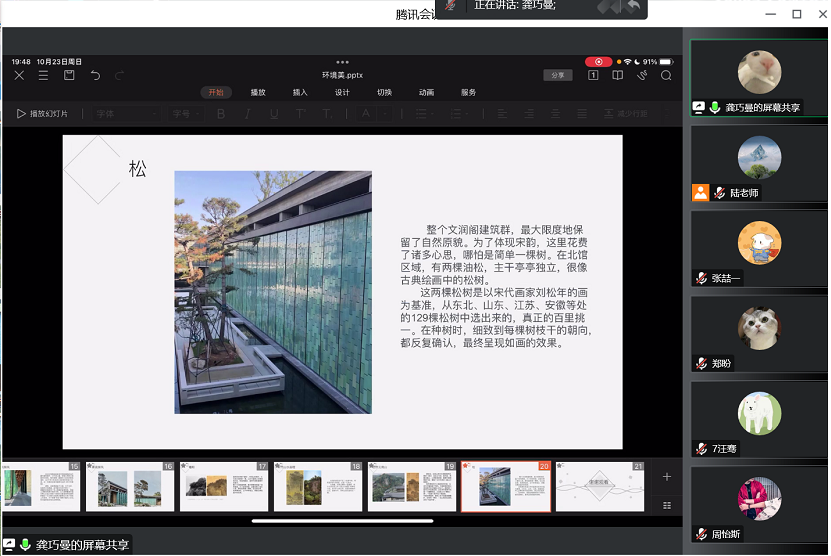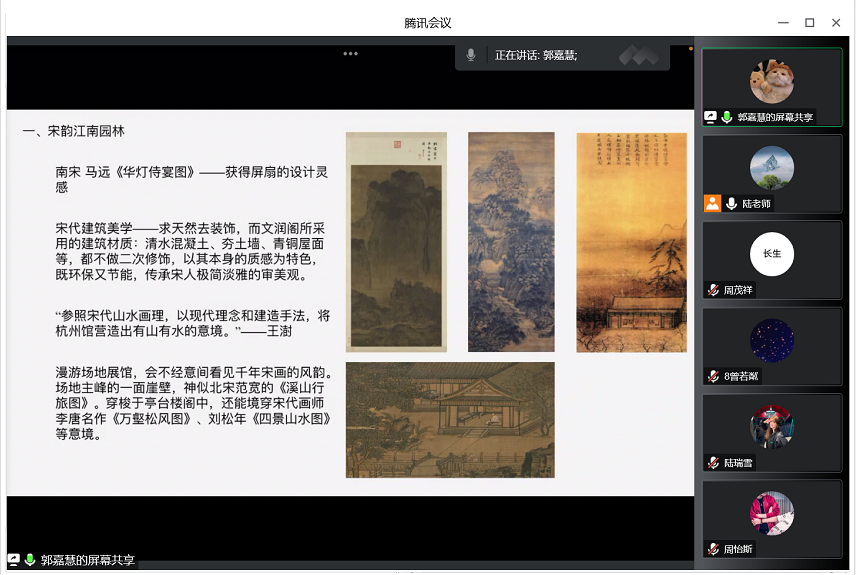 本次论坛由两班同学分8组依次汇报,中间有“老师点评”、“学生抽签随机互评”和自由讨论的环节,同学们与老师积极互动并参与讨论,氛围轻松、愉悦。本次汇报最突出的是郭嘉慧的小组,该小组探讨杭州国家版本馆宋韵美的体现,从龙泉青瓷屏扇门、青铜覆面双曲瓦片、东方韵味竹纹清水混凝土等东方元素的材料美,融汇现代和古典、中国和西方的建造之美去层层阐述国家版本馆宋韵美的实现,内容充实,条理清楚。