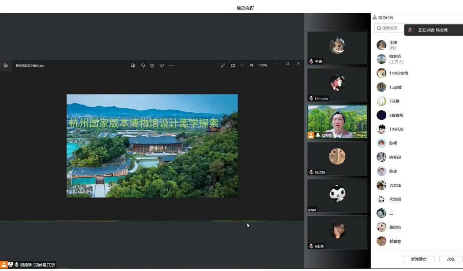第六期本科生论坛顺利召开。论坛主题为《杭州国家版本馆的设计美学探索》,由陆兴忍老师主持,环艺1901、1902班全体同学参加,历时3个小时。会上同学们就2022年8月开放的杭州国家版本馆的某一设计美学特点分组有序地汇报交流,同学们分别探讨了杭州国家版本馆建筑美、材质美、环境美、宋韵美等的呈现和得以实现的技术高度、设计手法和文化艺术魅力。