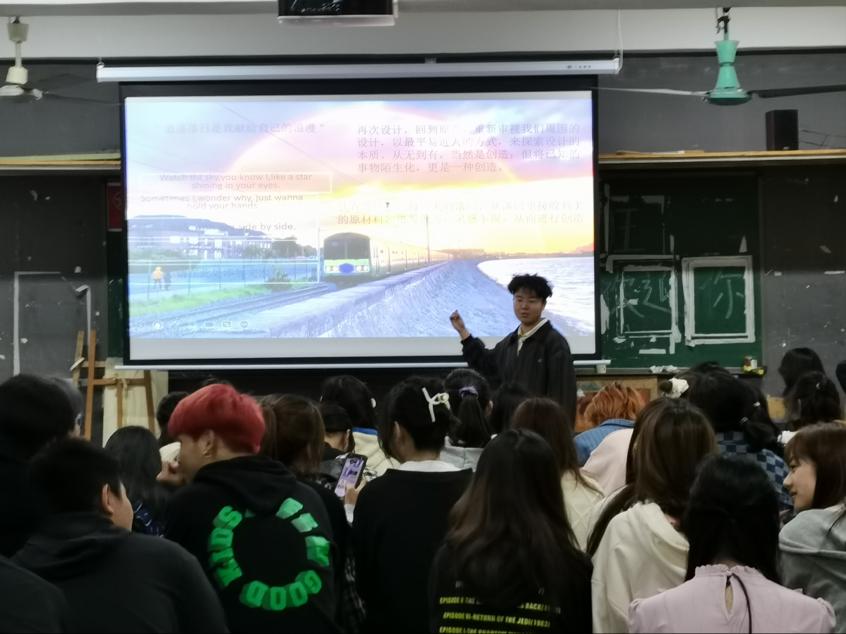 黄磊同学阐述了关于设计的美感,设计的背景,人们对于设计的看法以及设计师的目的,并生动的展示了设计的实例图,让在座的同学都对设计研究产生了浓厚的兴趣。