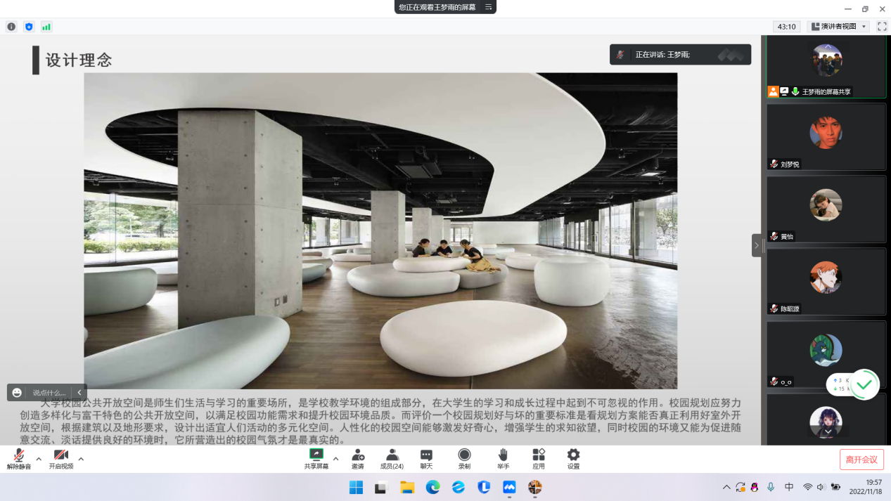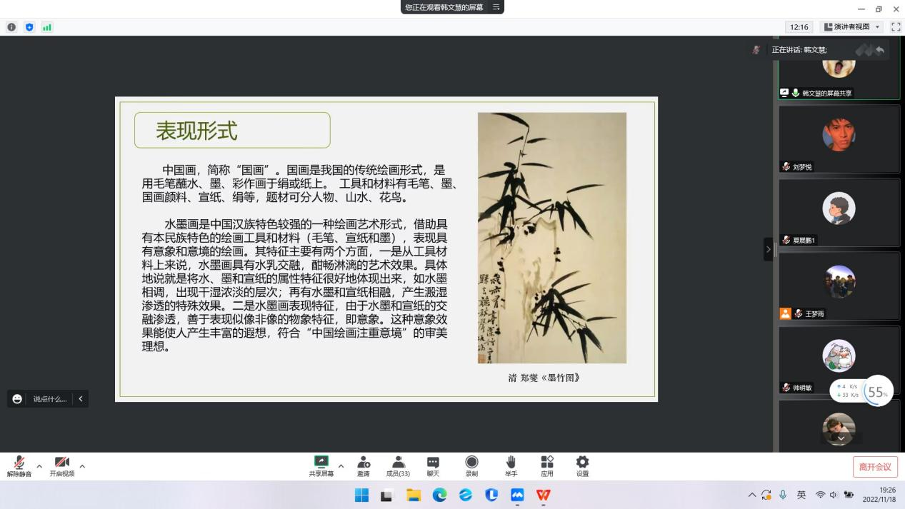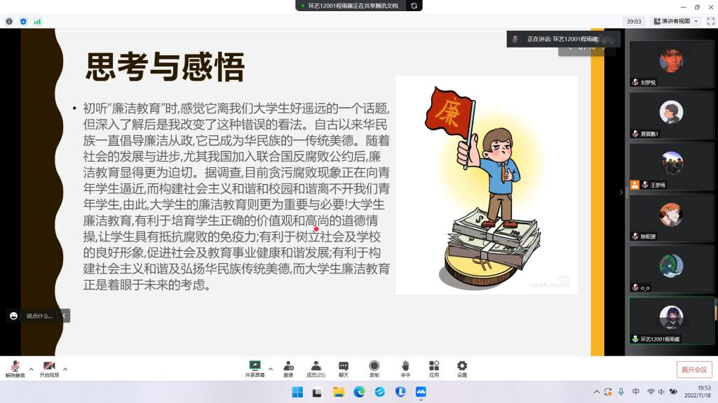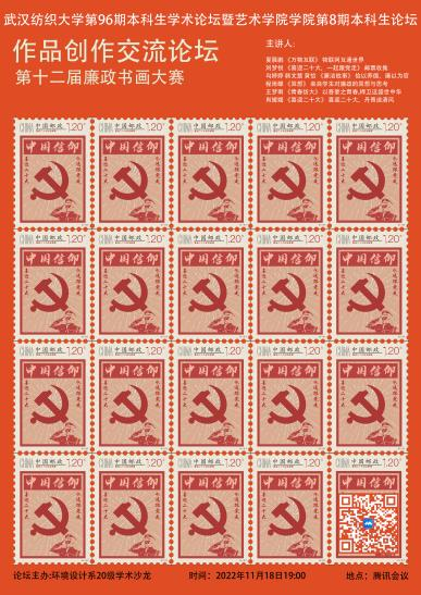 决定举办面向全校的第十二届“我爱阳光” 廉洁教育 艺术设计与绘画作品大赛暨第六届艺术思政作品展。本次大赛围绕“喜迎二十大,笔墨扬正气,丹青送清风”的主题展开。同学们积极踊跃的参与了大赛,部分同学获得了较好的名次。11月18日晚上,艺术学院环境设计系组织该系三年级学生在线上进行了第十二届廉政书画大赛作品创作交流本科生论坛活动,主讲人为环境设计系夏展鹏、刘梦悦、勾婷婷、韩文慧、黄怡、程雨蝶、王梦雨、肖媛媛八位同学。