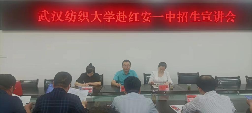 在红安一中,校长汪绪林、副校长高龙井代表学校师生热烈欢武汉纺织大学一行前来开展招生宣传,并重点介绍了学校的生源特色。刘元文就学院专业建设、学生就业情况进行介绍,并向红安一中表达了学院对引荐、推送更多优质生源的期望。