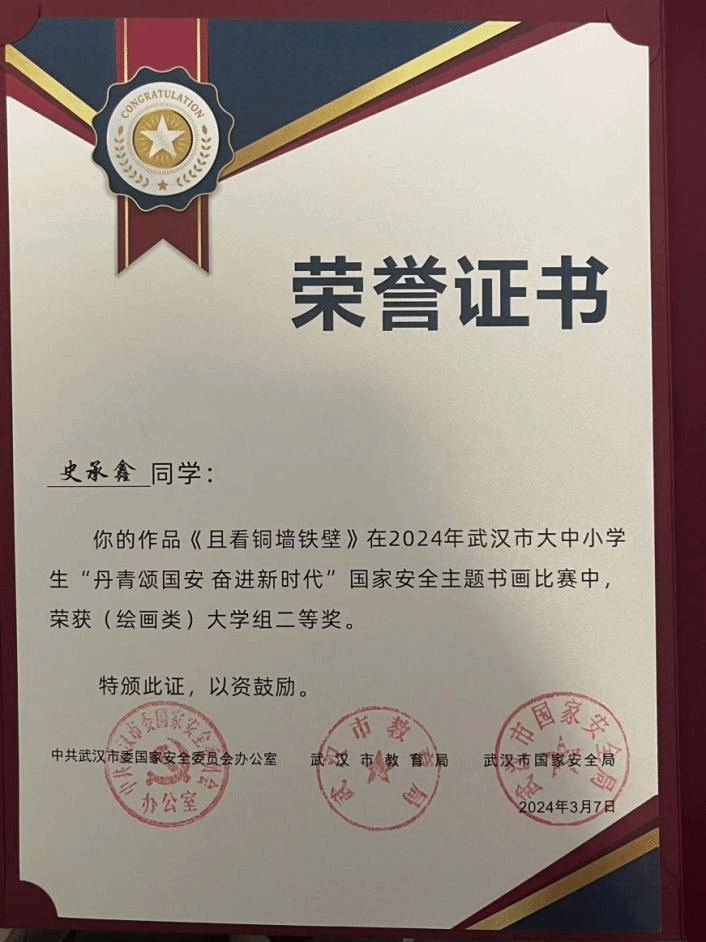 日前,由中共武汉市委国家安全委员会办公室、武汉市教育局、武汉市国家安全局联合举办的“丹青颂国安 奋进新时代”武汉市大中小学生国家安全主题书画比赛落下帷幕,我校色情直播平台 2023级本科生史承鑫的参赛作品《且看铜墙铁壁》在比赛中荣获二等奖。