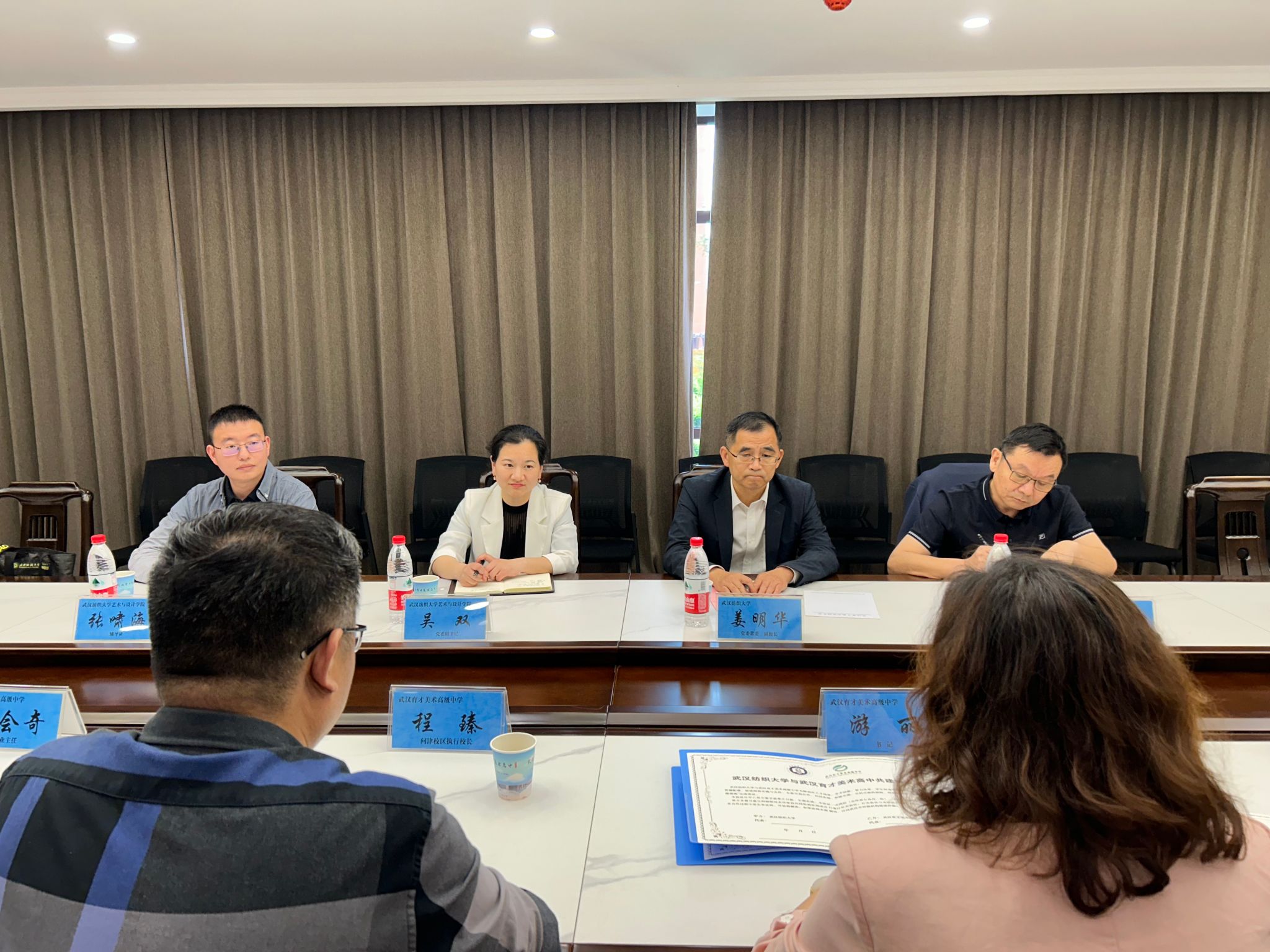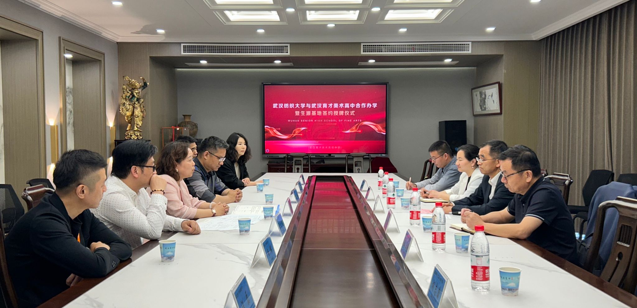 姜明华对学校热情接待表示感谢,他介绍了武汉纺织大学学科建设、专业发展、招生就业等情况。他对育才美高的发展历程和取得的成绩给予高度评价。双方围绕人才培养、教学改革、美育教育等进行了深入交流探讨。他表示,希望双方深化合作,携手共进,共同实现高质量发展。随后,双方签订了《武汉纺织大学优质生源基地共建协议书》并进行了授牌仪式。