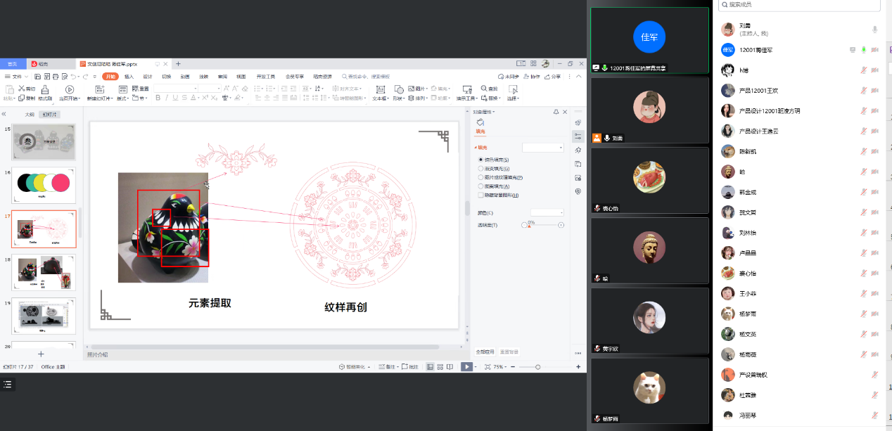 非物质文化遗产的传承与活化一直是国内高校产品与视传专业的重要培养方向,为了更好的让学生了解我国传统文化的背景和内涵,2022年11月22日产品教研室刘勇老师举办了一场以“文创产品设计-传承与活化”为主题的本科学术沙龙,以线上会议的形式进行,产品12001班与视传12003班参与了此次会议。