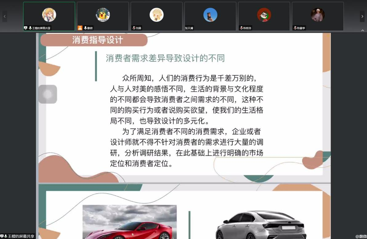 王橙、刘凤等这一组同学给大家分享了设计与消费的的相互关系,从消费者心理、流行趋势、设计的实用性等不同的角度阐述了消费与设计之间互相促进、彼此成就,共同构建美好生活的图景。