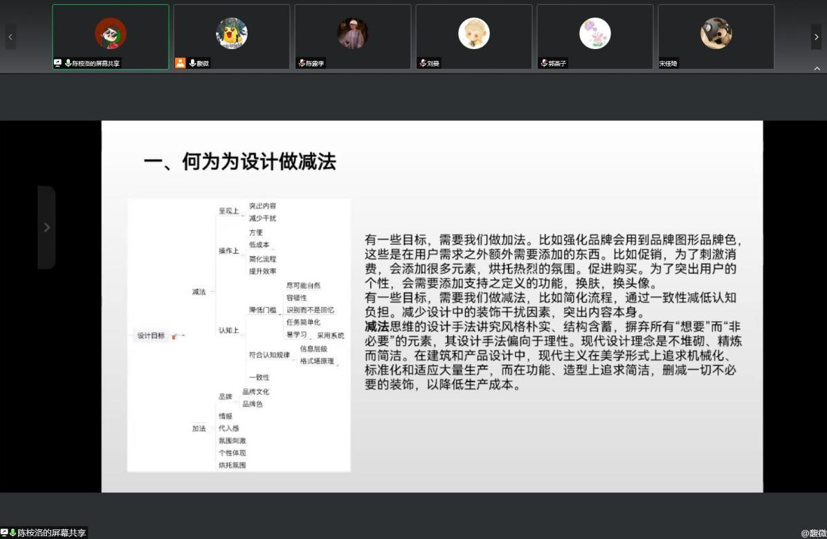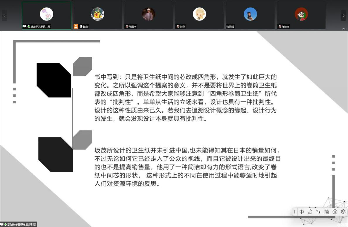 本次活动的主题围绕原研哉的《设计中的设计》一书展开。全班同学积极参与,分为六个小组,分别进行主题汇报和分享。