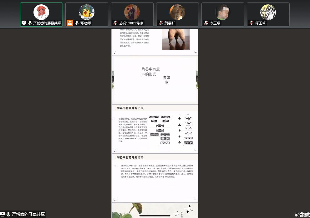 严博睿、王枭等这一组同学分享的主题为:陶器中有意味的形式。论述了原始彩陶的装饰图案从具象的动物纹、植物纹逐渐演变为抽象的几何纹,体现了原始艺术从再现性到表现性的转变,从摹仿现实的指示性到表现精神世界的象征性这一具有普遍性的艺术风格上的变化。