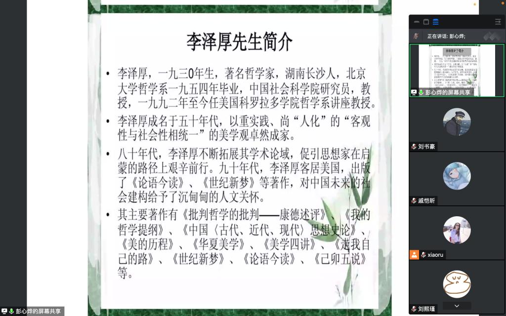 随着12004班彭心烨同学对于《美的历程》的汇报讲解的结束,本次活动也到此为止。这次活动无疑为同学们增添了更多专业性知识,也让同学们更加了解自己所学的专业,具有深远意义。