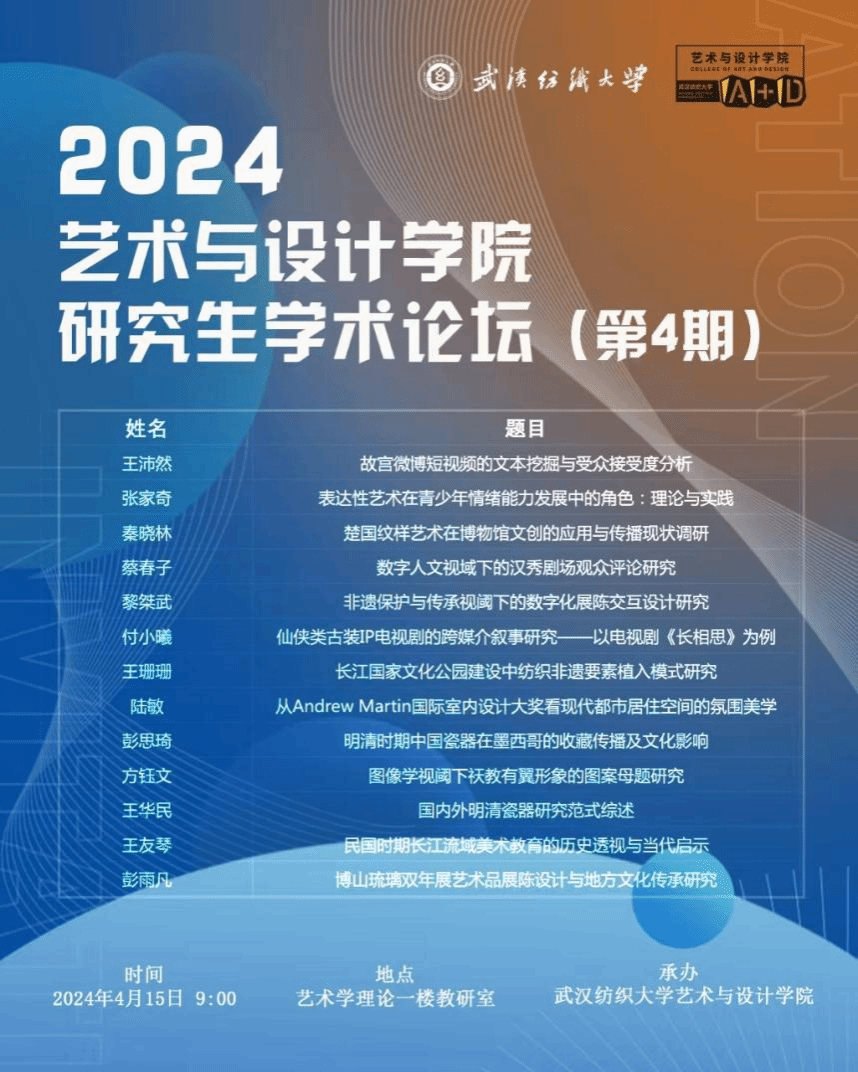 论坛会上,研究生们围绕各自研究领域,以图文并茂的PPT、条理清晰的讲解,详尽阐述了汇报主题的研究背景、理论框架、实证分析及结论展望,展现了同学们敏锐的问题意识和宽广的知识视野。其中,王珊珊同学针对长江国家文化建设,以独特的见解探析纺织非遗要素如何恰当地融入其中,为公园建设赋予独特魅力,引发了现场的热烈讨论;方钰文同学则凭借严谨的逻辑推理,运用潘诺夫斯基图像学研究对祆教有翼形象的图案进行了深度挖掘,赢得了在场师生的高度赞誉。