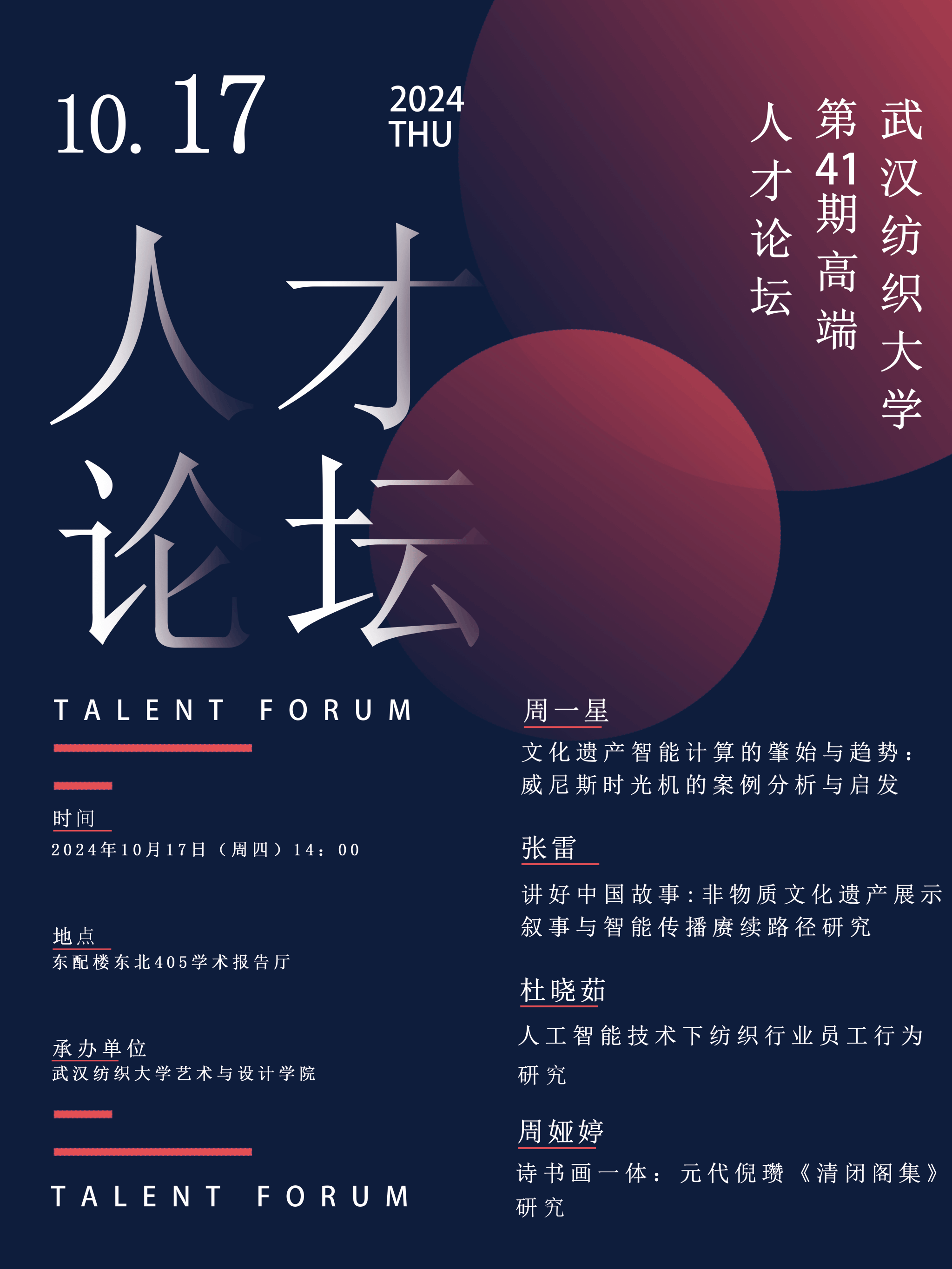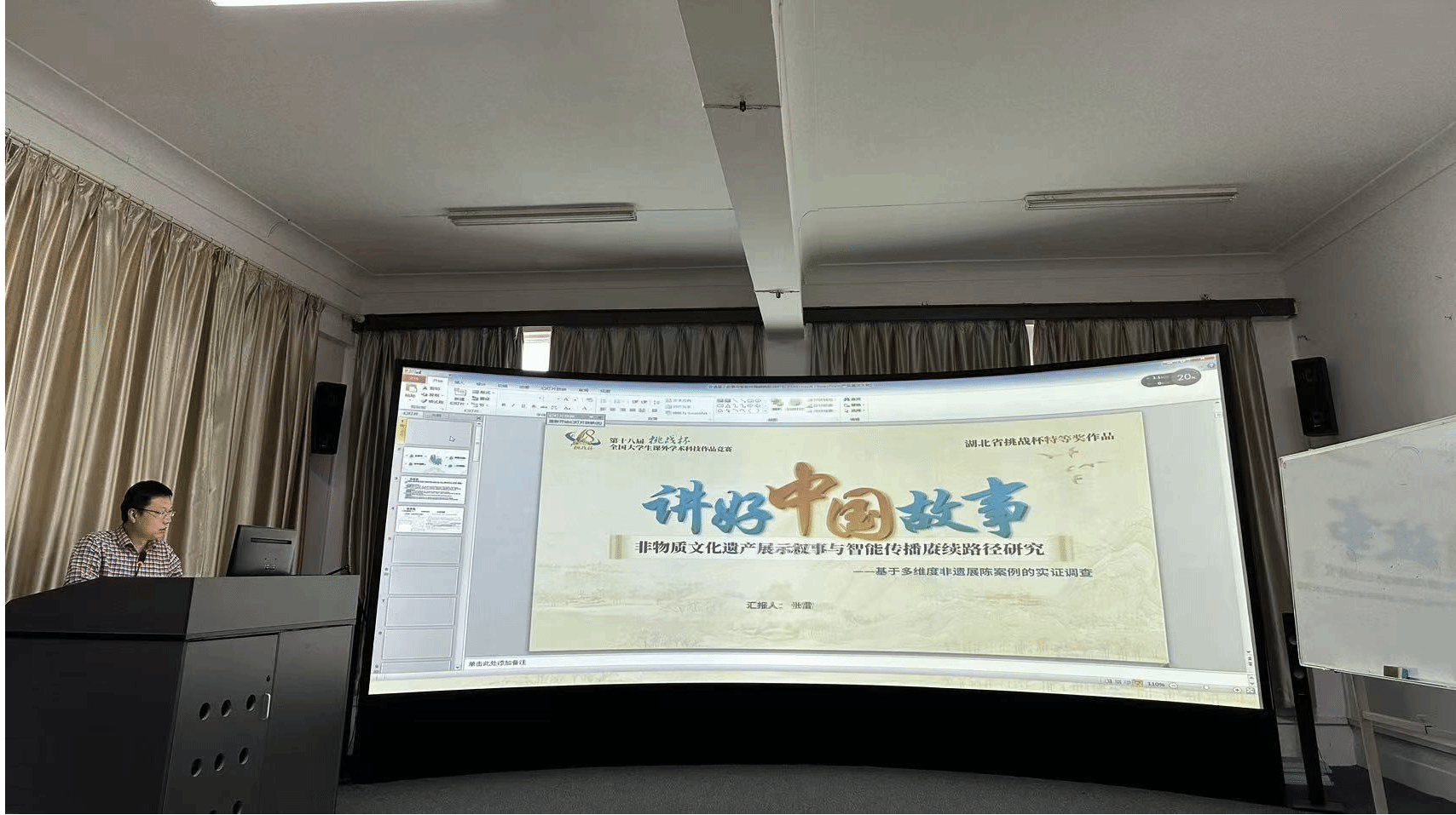 张雷博士以《讲好中国故事:非物质文化遗产展示叙事与智能传播赓续路径研究》为题作汇报交流,他以“挑战杯”竞赛育人为核心,致力于非遗的保护传承与传播,推动中华优秀传统文化创造性转化、创新性发展。他讲述了带领学生团队走访常设展馆等100多家,参与策展“锦绣中华-中国非遗服饰秀”等国家级展览10多项,梳理出非遗传播机制不健全不完善等问题,提出“双传驱动”、“展育并举”“技艺融合”、“智媒融合”非遗展示叙事与智能传播赓续路径。